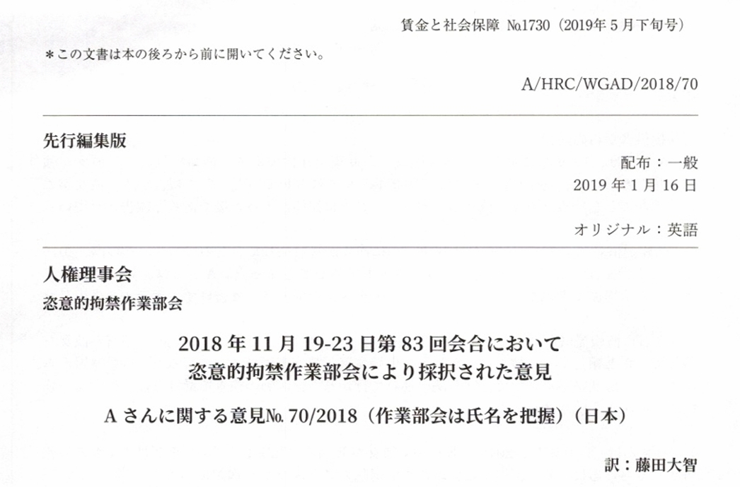 恣意的拘禁作業部会(国連人権理事会)により採択された意見 2019年 訳:藤田大智 (賃金と社会保障 No1730 2019年5月)をアップします。