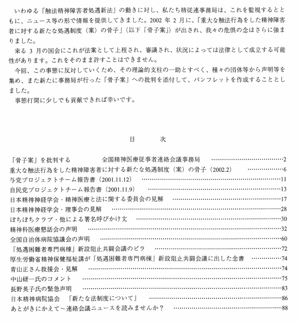2025-12-05 / 最終更新日時 : 2025-12-05 mysy 各種集会・講演会記録Records of various meetings and lectures 「触法精神障害者処遇新法」に反対します 全国精神医療従事者連絡会議事務局 「触法精神障害者処遇新法」に反対します 全国精神医療従事者連絡会議事務局 発行のパンフです。目次は以下です: pdf版:「触法精神障碍者処遇新法」に反対します パンフレット