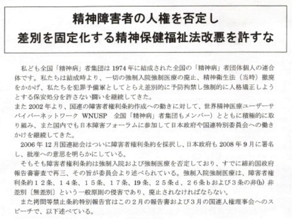 国連報告資料「精神障害者の人権を否定し差別を固定化する精神保健福祉法改悪を許すな」2013年5月
